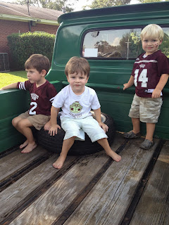 | The cutest picture EVER! Pa holding Jonathan, Luke jumping off the truck, and Thomas and Parker with Nanny. |